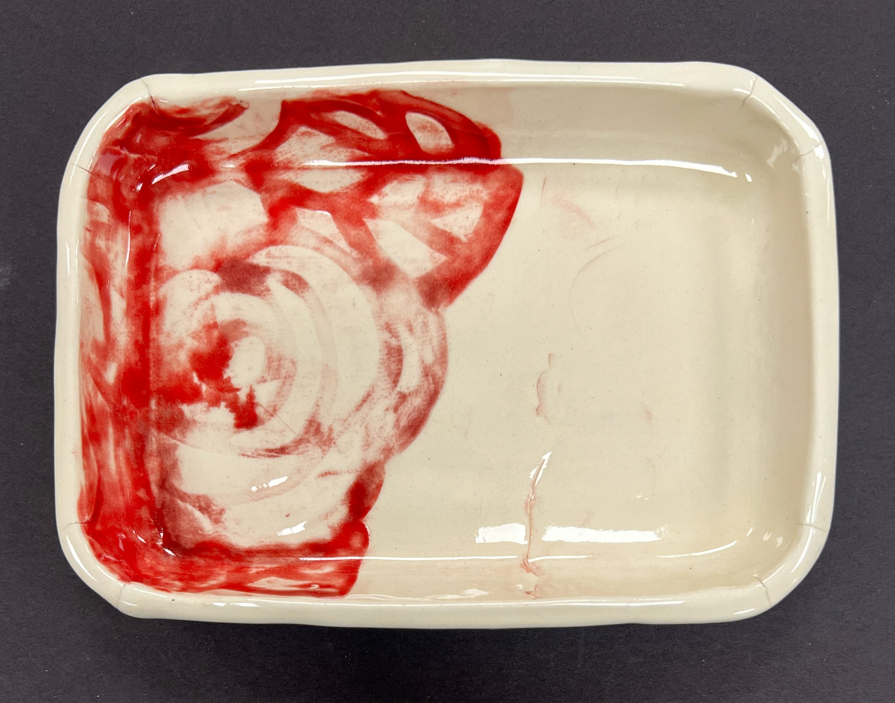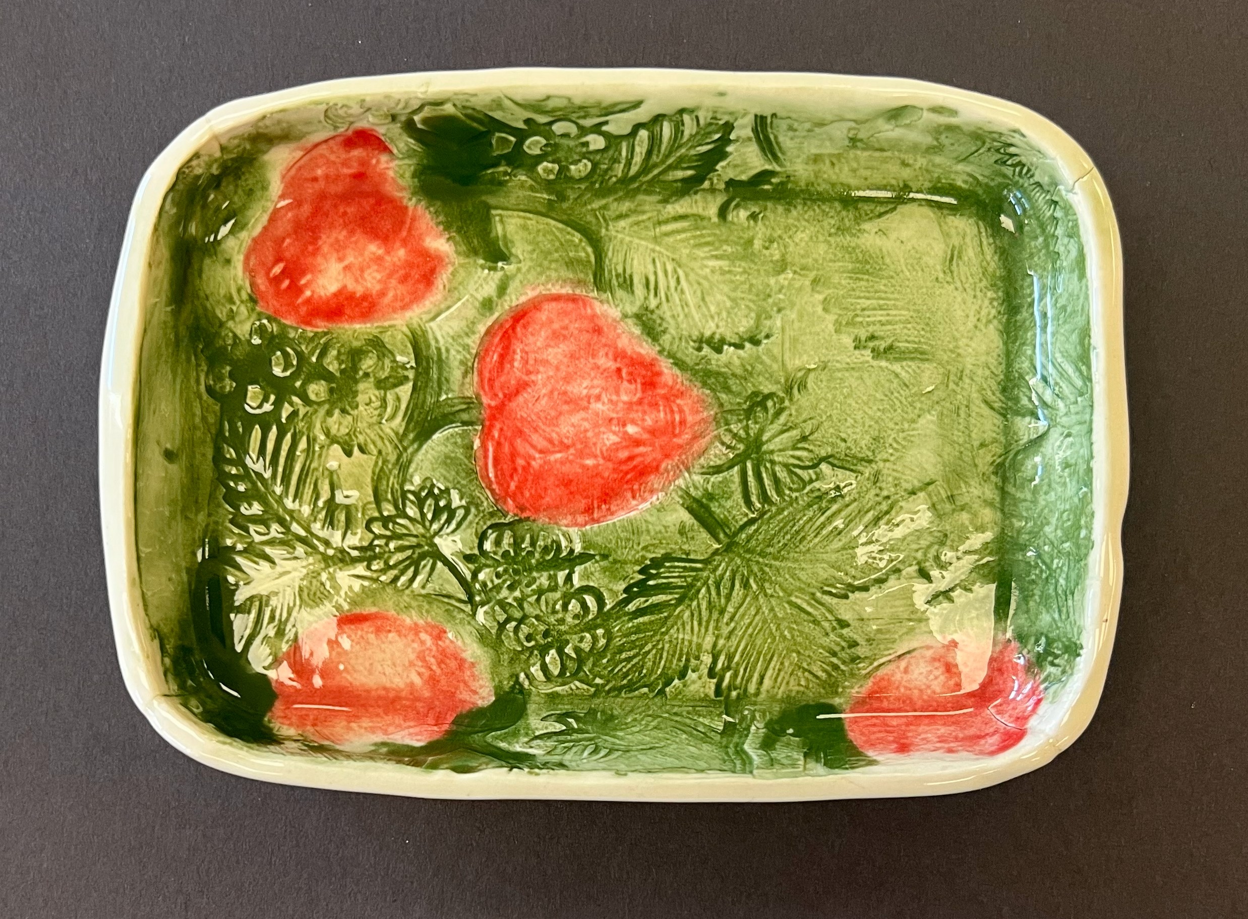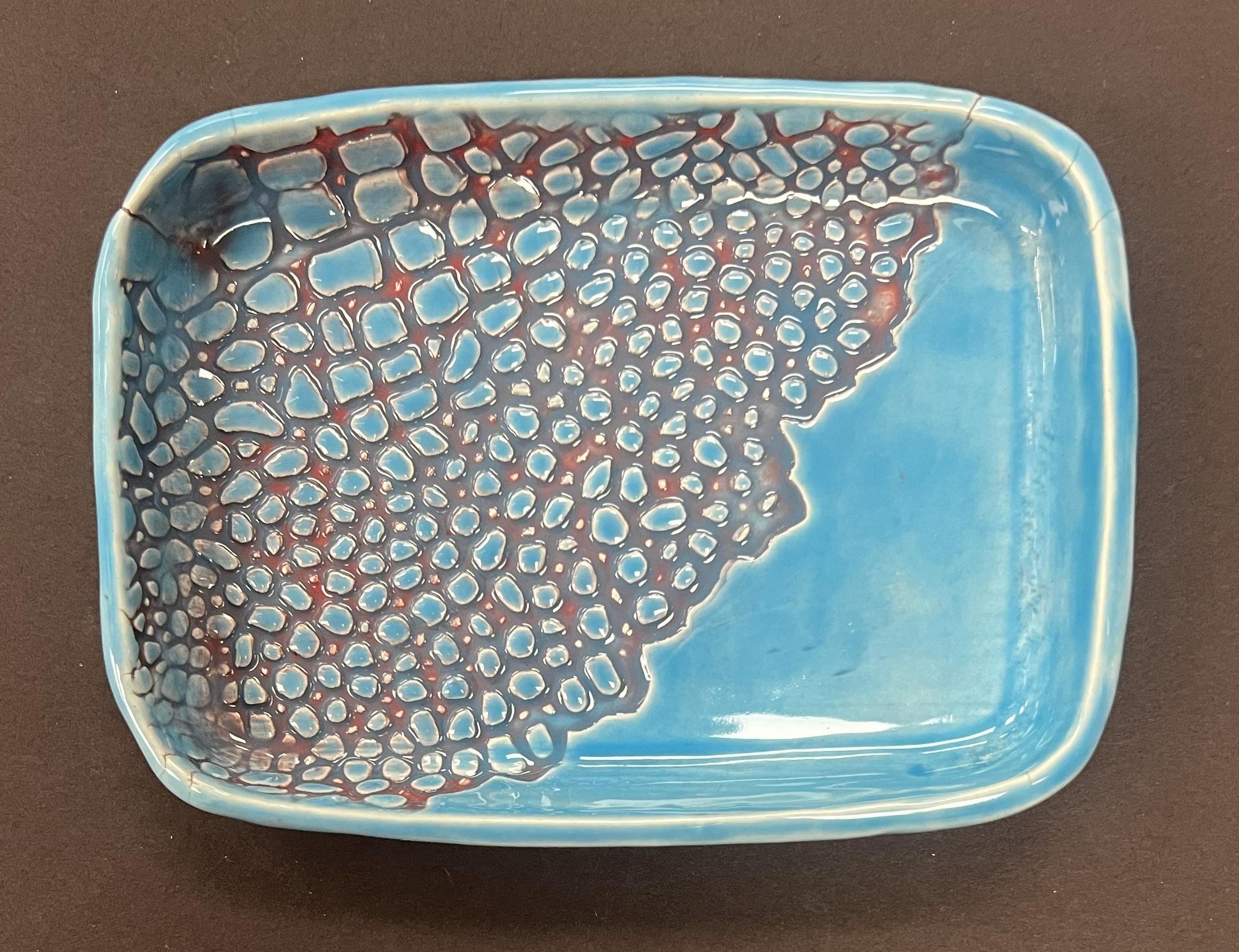 These soft slab dishes were created as part of a collaborative fundraising project to benefit BEA's NHS Holiday Families project. Mrs. Cox's 8th graders rolled textured vinyl mats onto clay slabs, formed the slabs around wooden forms, and then finished the rims and glazed the trays to accent the texture once they were bisque fired. The trays are created with low-fire clay and glazes. In addition to use as soap dishes, they can be catch-all’s for spare change/jewelry/office supplies like Post-it's and paperclips or for unpeeled/uncut lemon, garlic, ginger, etc… trays or for wrapped food like candies. Minor “imperfections” are considered a valuable mark of the maker and distinguish handmade items from machined and mass-produced objects.